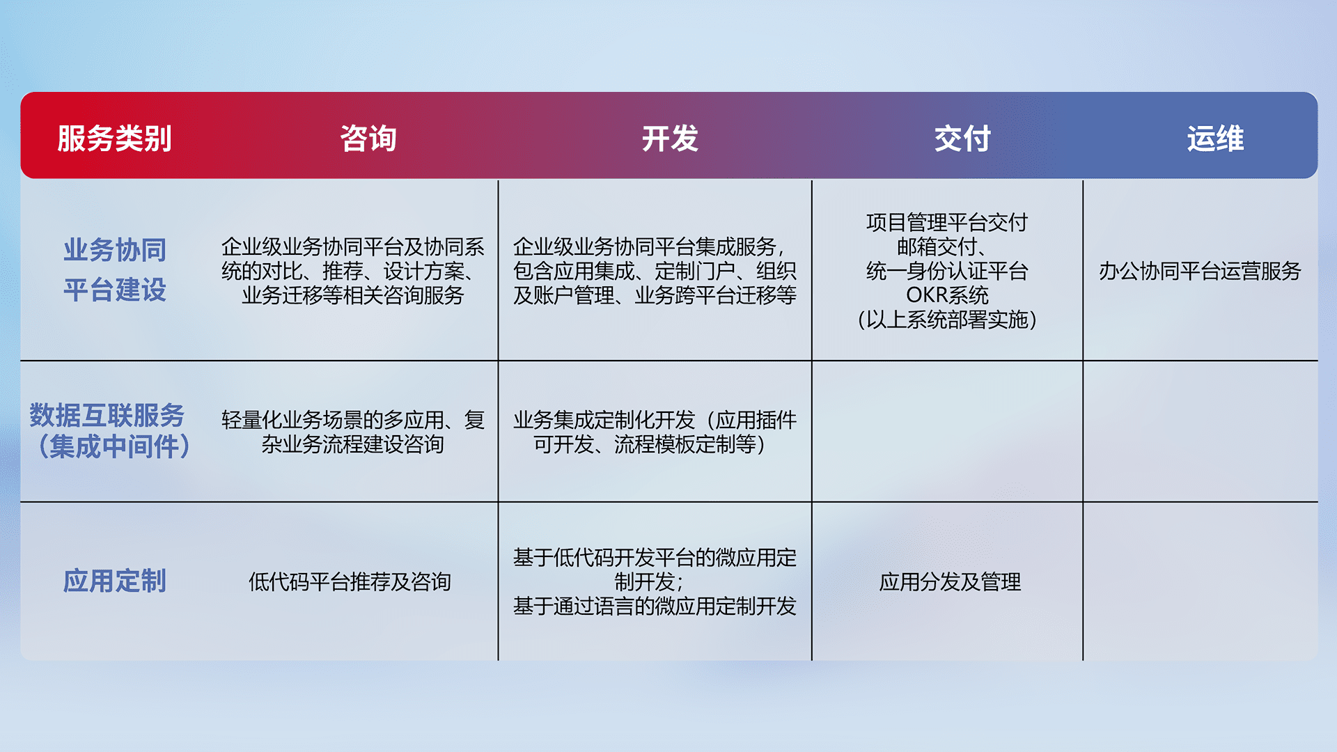 针对钉钉、、企微、、、IDaas等平台级产品提供产品的规划、、、、方案、、、、交付、、、定制化开发等服务,,,实现如统一协同办公、、智能客户服务、、混合会议管理、、智能数据查询、、、、等业务场景,,实现数字化转型。。。。